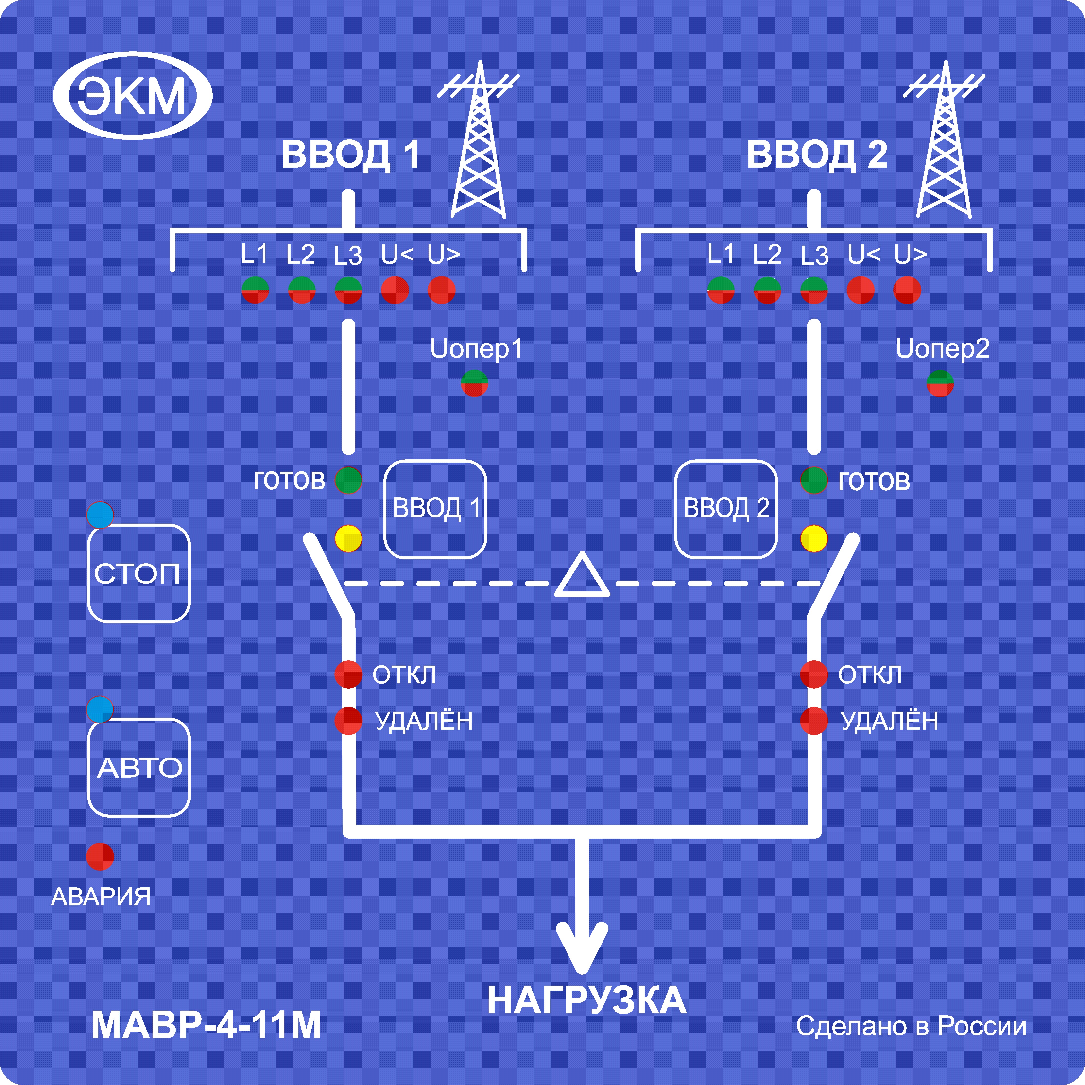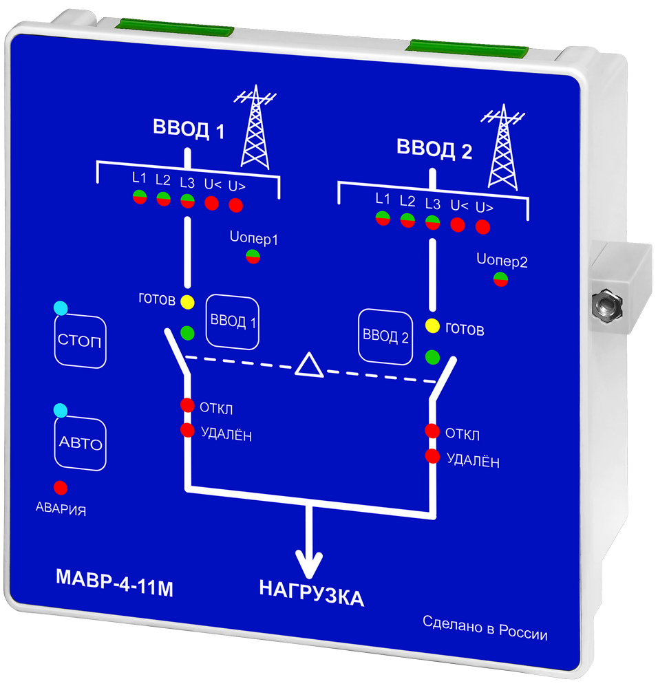 Модуль автоматического ввода резерва МАВР-4-11М (далее Устройство) предназначен для использования в схеме питания два вводаи и одна нагрузка. Устройствот управляет коммутационными механизмами для переключения нагрузок с основного источника питания на резервный (при возникновении аварии на основном вводе) и возврат к исходной схеме питания при нормализации рабочих параметров основного источника питания. Управление коммутационными механизмами осуществляется в ручном или автоматическом режиме. В качестве коммутационных механизмов могут применяться электромагнитные контакторы или автоматические выключатели (с моторприводом).
