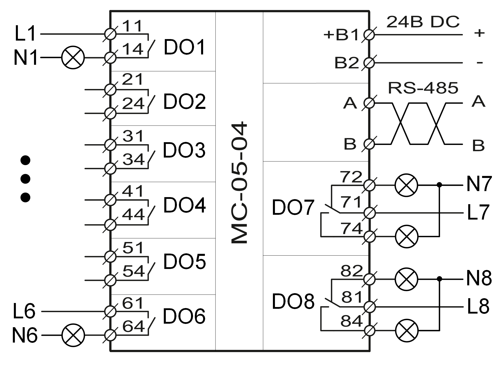 Управление МС-05-04 осуществляется через запись значений в регистры Modbus, где каждый дискретный выход соответствует отдельному реле, состояние которого контролируется через выделенные регистры состояния. При подачи команды управления контактные группы переходят из нормально разомкнутого состояния в нормально замкнутое (замыкаются контакты х1-х4, х - номер группы контактов) и размыкаются контакты 71-72 и 81-82. При снятии команды управления, контакты х1-х4 размыкаются (х - номер группы контактов), а 71-72 и 81-82 замыкаются.