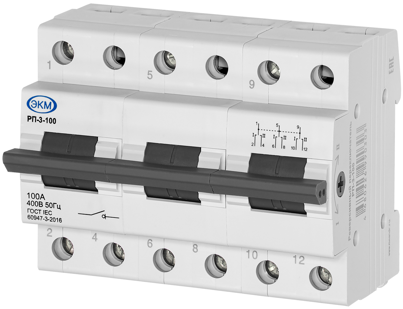 Реверсивные переключатель РП-3-100 арт. 4680626990303 применяется для ручного переключения нагрузки с одного ввода на другой и обратно, а также позволяет осуществлять оперативное управление участками электрических цепей.