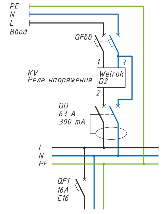- для защиты от короткого замыкания и превышения мощности в цепи нагрузки обязательно необходимо перед устройством установить автоматический выключатель (QF). Автоматический выключатель устанавливается в разрыв фазного провода;