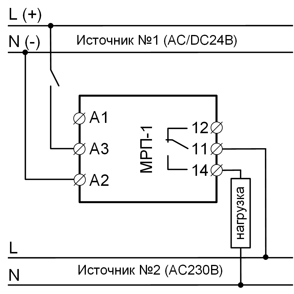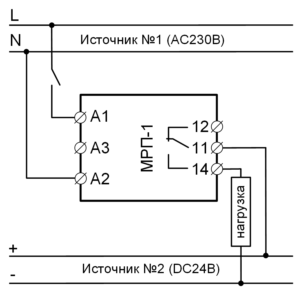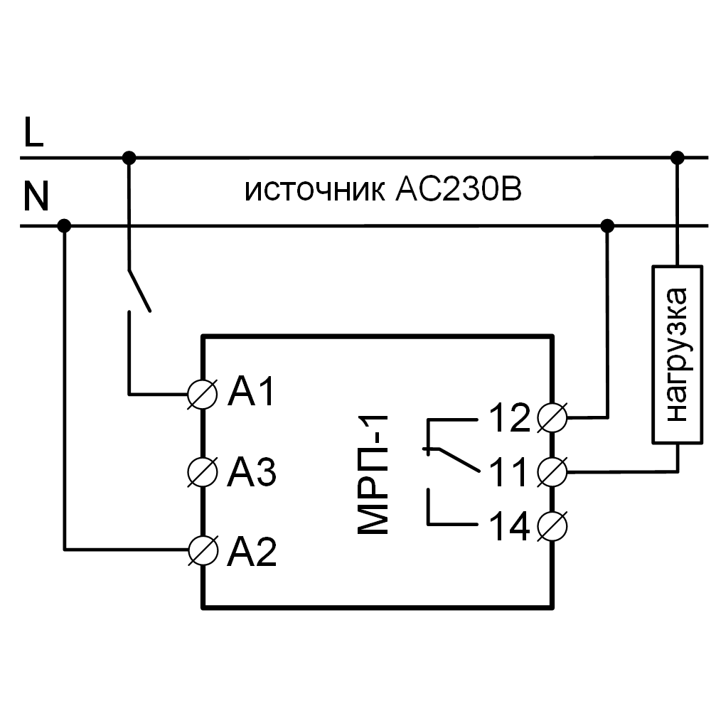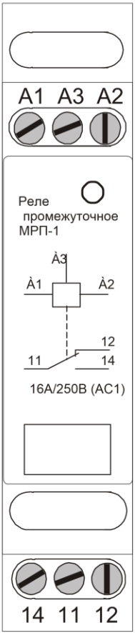 ОБРАТИТЕ ВНИМАНИЕ! После подачи питания на контакты А1 и А2 (А3) никакого напряжения на контактах 11,12,14 не появится. Так, как цепь питания МРП-1 и контактные группы не связаны между собой электрически внутри.