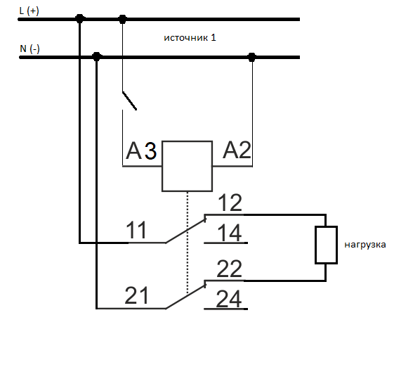 ОБРАТИТЕ ВНИМАНИЕ! После подачи питания на контакты А1-А2 (А3) никакого напряжения на контактах *1,2,4 не появится. Так, как цепь питания МРП-2-1 и контактные группы не связаны между собой электрически внутри.