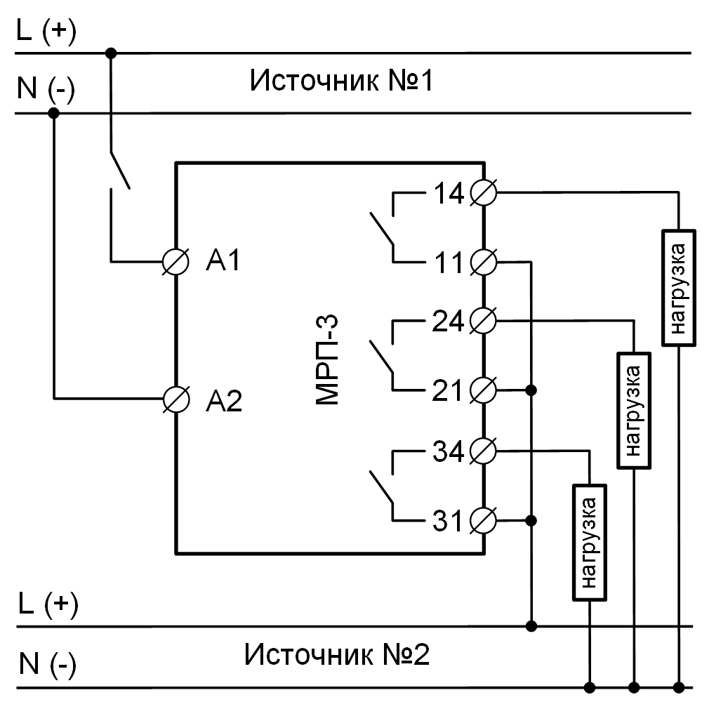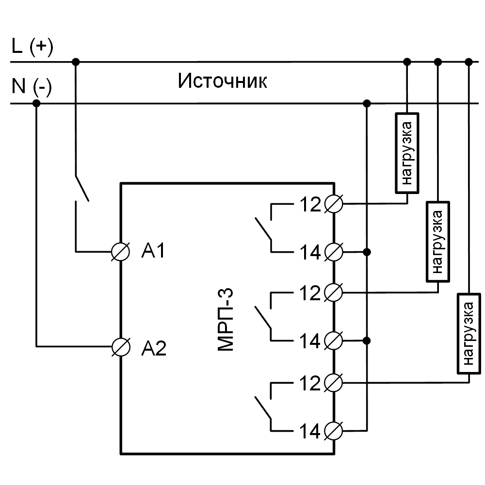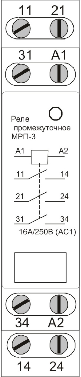 ОБРАТИТЕ ВНИМАНИЕ! После подачи питания на контакты А1-А2 никакого напряжения на контактах *1, *4 не появится. Так, как цепь питания МРП-3 и контактные группы не связаны между собой электрически внутри.