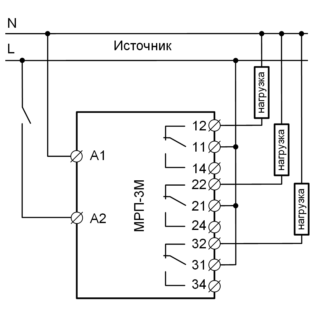 ОБРАТИТЕ ВНИМАНИЕ! После подачи питания на контакты А1-А2 никакого напряжения на контактах *1,2,4 не появится. Так, как цепь питания МРП-3М и контактные группы не связаны между собой электрически внутри.