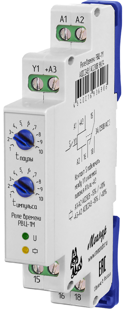 При подаче питания на устройство происходит включение реле. При поступлении управляющего сигнала начинается отсчет работы реле (импульса), после чего реле выключается на длительность установленного времени паузы. После отсчета времени паузы происходит повторное включение реле. После включение реле работает до момента отключения напряжения питания или получения повторной внешней команды, после чего цикл повторяется. Длительность паузы и импульса устанавливаются соответствующими переключателями множителя и базового значения времени;