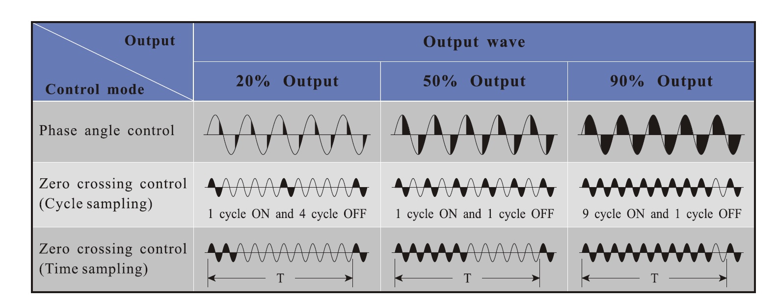 Zero Time Sampling - Пакетный способ регулировки мощности. Устройство осуществляет открытие тиристоров на определенное число периодов, формируя "пакет" с длительностью пропорционально установленной мощности нагрузки. Число периодов в течении которых тиристоры остаются открытыми определяется по формуле: N=TxP/100 Где: