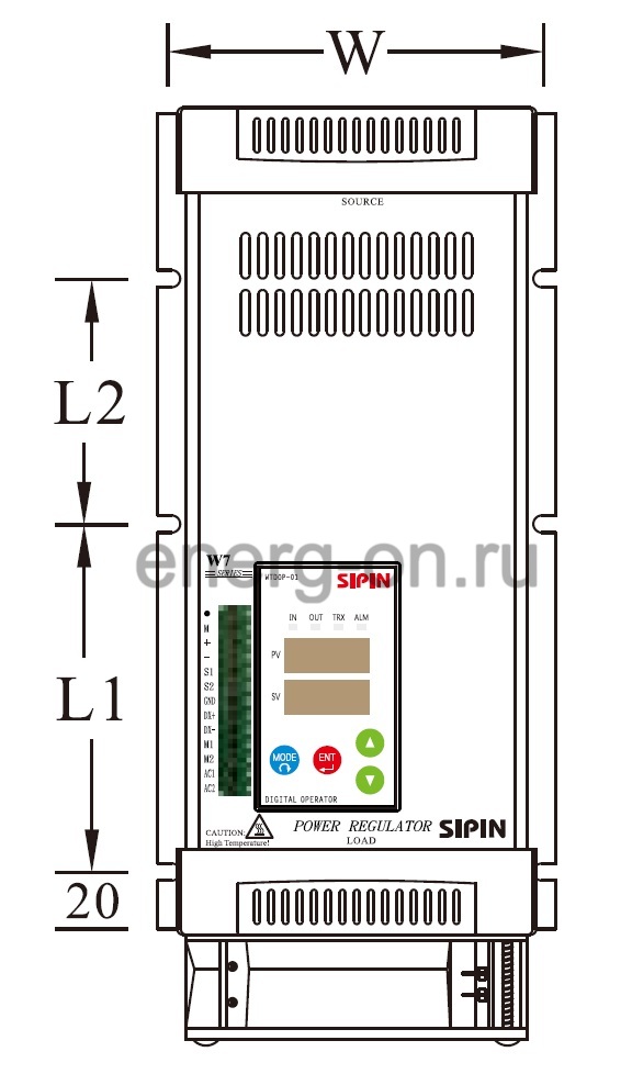 Однофазный тиристорный регулятор мощности W7-S4V150-21KP (далее Устройство) предназначен для плавной регулировки мощности нагрузки в однофазных сетях. Устройство применяется для регулировки мощности как активной, так и реактивной нагрузки (тэны, инфракрасные нагреватели, системы освещения, трансформаторы и т.д.). С помощью 2-3 Устройств можно осуществлять регулировку мощности нагрузки в трехфазных сетях. Не рекомендовано использование для регулировки мощности систем освещения.