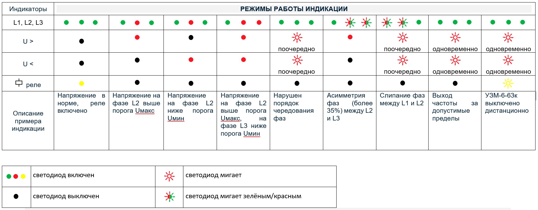 ОБРАТИТЕ ВНИМАНИЕ! При подаче одной и той же фазы на входы УЗМ-3-63к, напряжение на защищаемый участок цепи (на нагрузку) подано не будет, так как будет нарушен порядок чередования фаз (красные светодиоды "U>" и "U<" мигают поочередно).
