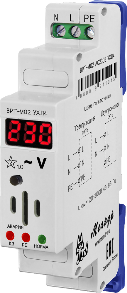 Цифровой вольтметр-измеритель тока короткого замыкания ВРТ-М02 арт. 4680019911045 (далее ВРТ-М02) предназначено для контроля текущего значения напряжения в электрических цепях переменного тока, а так же постоянного контроля величины тока короткого замыкания в цепи "Фаза-Ноль" и мониторинга состояния защитного провода PE.